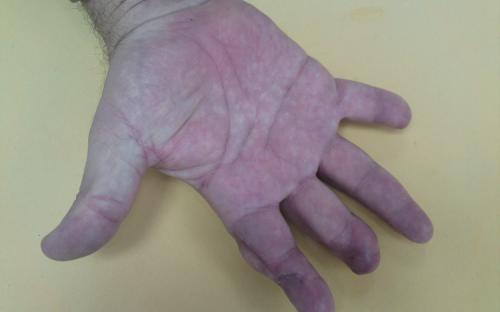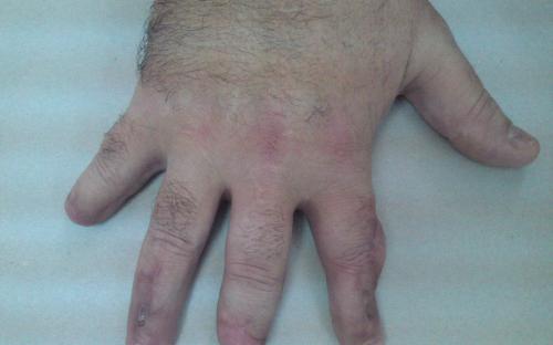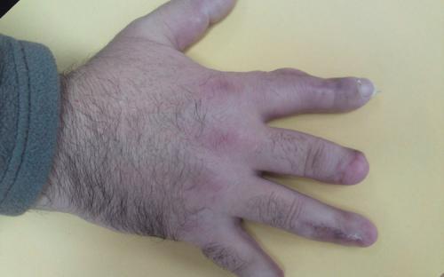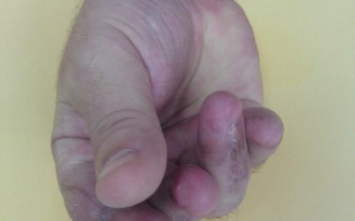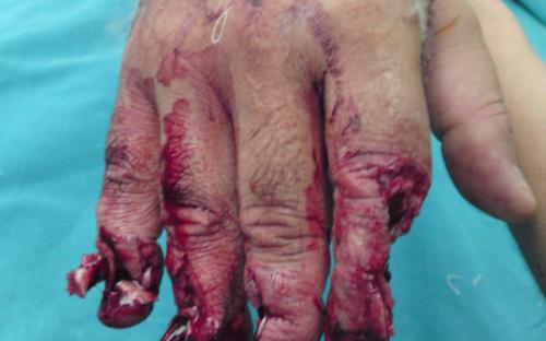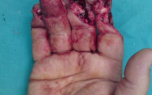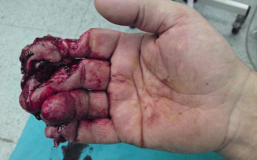 Νέος άνδρας που υπέστη ακρωτηριαστική βλάβη των δακτύλων του δεξιού του χεριού με ξυλουργικό τροχό. Παρόλη την ένδειξη για ακρωτηριασμό, έγινε προσπάθεια ανακατασκευής των δακτύλων και ο ασθενής απέκτησε ένα λειτουργικό χέρι.