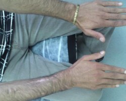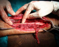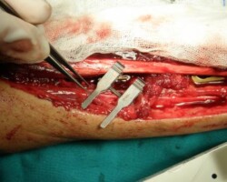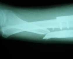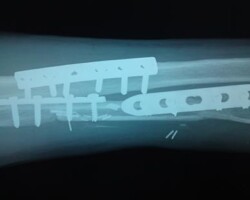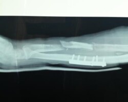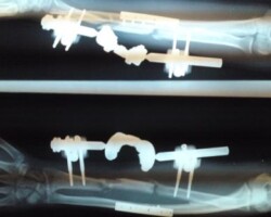 Άντρας 21 ετών υπέστη διπολικό κάταγμα της κερκίδας και κάταγμα της ωλένης, που αντιμετωπίστηκε σε περιφεριακό νοσοκομείο. 9 μήνες μετά διαπιστώθηκε ψευδάρθρωση της κερκίδας με οστικό απόλυμα 6,5 εκ. Αντιμετωπίστηκε με τη χρήση αγγειούμενης περόνης, η οποία γεφύρωσε το οστικό έλλειμμα της κερκίδας.