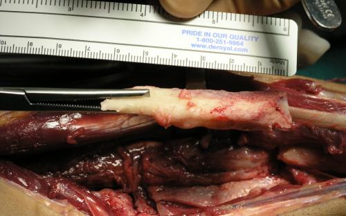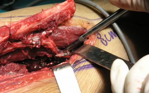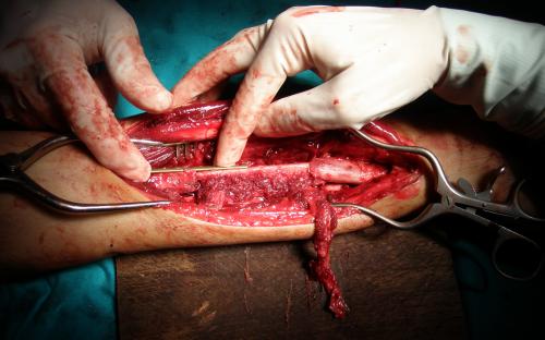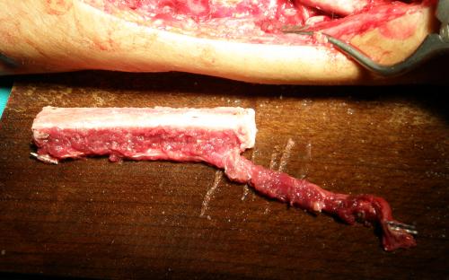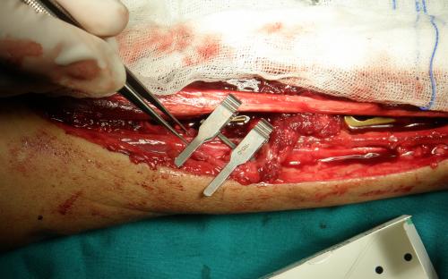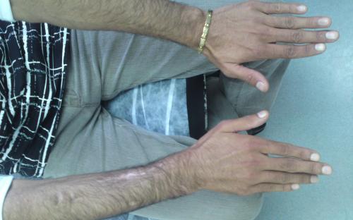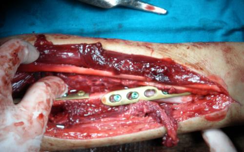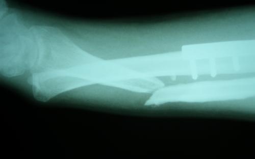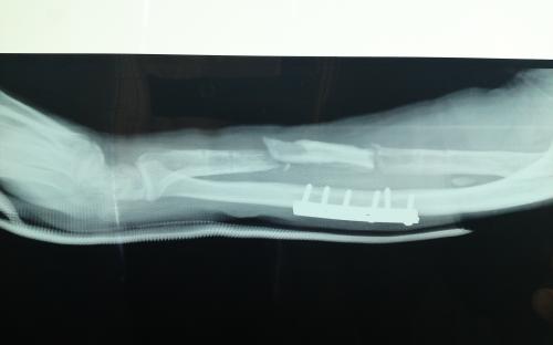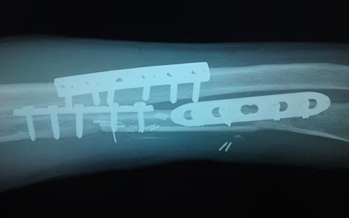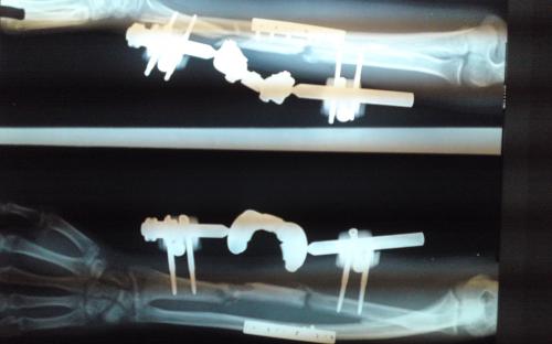 Άντρας 21 ετών υπέστη διπολικό κάταγμα της κερκίδας και κάταγμα της ωλένης, που αντιμετωπίστηκε σε περιφεριακό νοσοκομείο. 9 μήνες μετά διαπιστώθηκε ψευδάρθρωση της κερκίδας με οστικό απόλυμα 6,5 εκ. Αντιμετωπίστηκε με τη χρήση αγγειούμενης περόνης, η οποία γεφύρωσε το οστικό έλλειμμα της κερκίδας.
