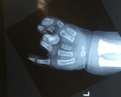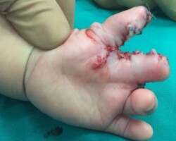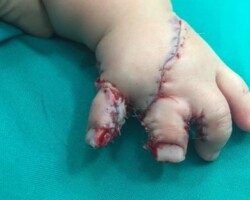 Παιδί με σύνθετη πλήρη συνδακτυλία του αντίχειρα, του δείκτη και του μέσου, στην οποία συμμετείχε μερικώς και ο παράμεσος. Αντιμετωπίστηκε με διαχωρισμό του αντίχειρα και απελευθέρωση της εγγύς φαλαγγοφαλαγγικής άρθρωσης του παράμεσου σε ηλικία 9 μηνών.