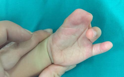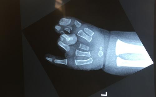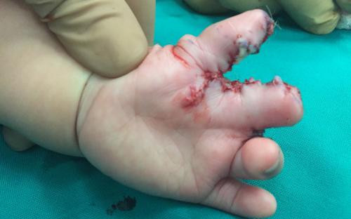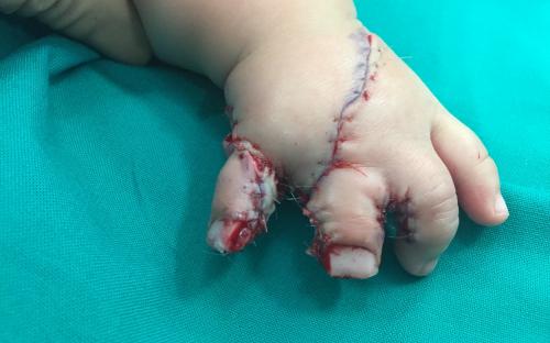 Παιδί με σύνθετη πλήρη συνδακτυλία του αντίχειρα, του δείκτη και του μέσου, στην οποία συμμετείχε μερικώς και ο παράμεσος. Αντιμετωπίστηκε με διαχωρισμό του αντίχειρα και απελευθέρωση της εγγύς φαλαγγοφαλαγγικής άρθρωσης του παράμεσου σε ηλικία 9 μηνών.
